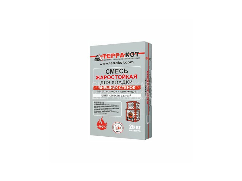 Смесь жаростойкая для кладки внешних стенок печей, каминов и дымоходов «Терракот»— готовый состав для кладки и ремонта внешних стенок дымоходных систем, уличных барбекю, мангалов, коптилен, грилей, а также лицевых контуров внутридомовых печей и каминов. Смесь может применяться для восстановления кладочных швов. Жаростойкость смеси составляет 400°С.